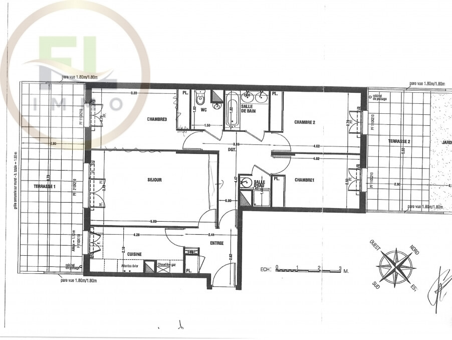 Donnant sur 2 terrasses, double orientation.