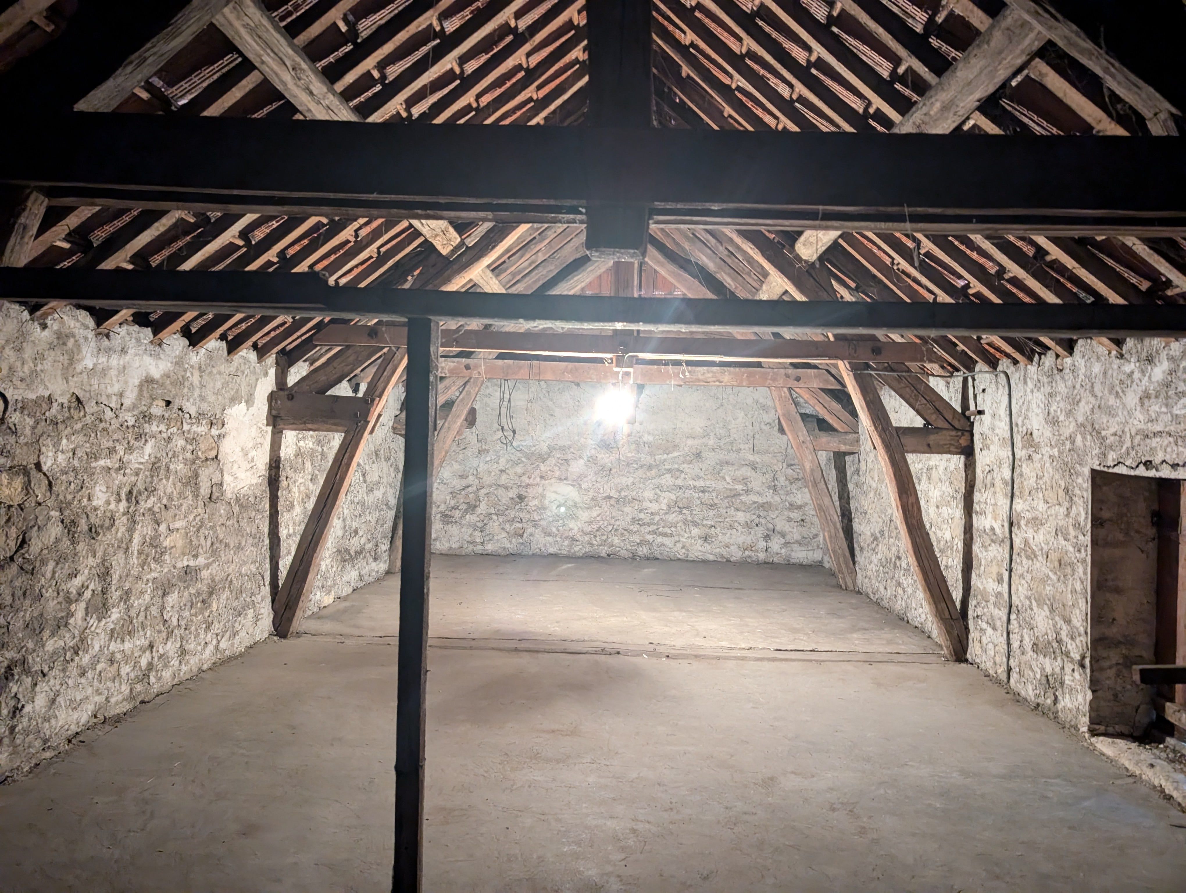 Dans la cour attenant à la maison principale un cellier , deux garage communiquant avec acces à l'étage sur une immense piece ( environ 70m²) avec poutres apparentes à aménager. Le jardin est clos et possibilité de garer plusieurs voitures.